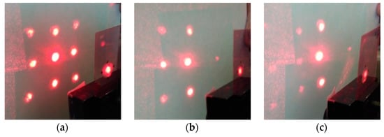(a) The diffraction pattern on a five beams splitter, the ratio of intensities I+1/I0 is 1: 1.5, (b,c) Change in the diffraction pattern when the element is rotated on 6° (b) and 25° (c).
