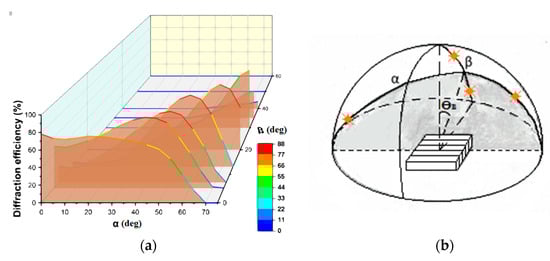 First, we consider the properties of volume gratings in Bayfol HX photopolymer when radiation is incident over a wide range of angles in three-dimensional space. Figure 7a shows the dependence of the diffraction efficiency of volume transmission non-slanted grating (with a period of 1.6 μm) on the angles α and β (Figure 7b) corresponding to the movement of the sun during the day and the seasonal change in height above the horizon. Diffraction efficiency measurements were carried out at a wavelength of 0.65 μm.