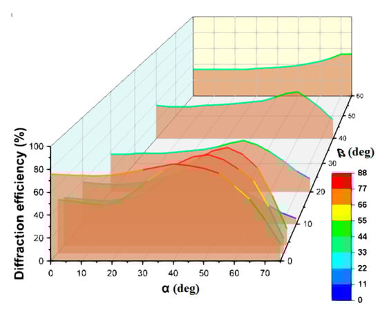 You can see many directions of radiation incidence on the grating (values of angles α and β) at which the maximum values of diffraction efficiency are achieved. It should be noted that when the direction of incidence changes in the Bragg plane (the plane slanted at a Bragg angle (ϴB) to the normal to the grating surface), the maximum diffraction efficiency (about 80%) remains in the range of angles α over 100°. When deviating from the Bragg plane, i.e., an increase in the angle β (up to 30°), the diffraction efficiency maximum shifts toward greater angles α. This result is important and solves the problem of solar radiation using at great angles of incidence, up to 70°.