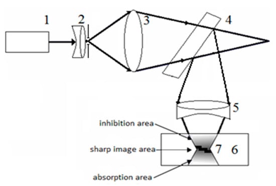 Scheme of holographic 3D printing with reducing the size of the projected image. (1) laser, (2,3) optical system forming the convergent beam, (4) hologram, (5) reducing optical system, (6) photopolymerizable material, and (7) holographic real image.