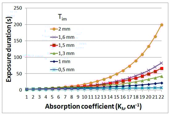 Dependence of exposure duration on absorption coefficient (kλ) of the material and localization of the projected holographic image (Tim). Tim = 0.5–2 mm, Ƞ = 20%, P = 200 mW, α = 0.5, S = 0.5 cm2, E0 = 0.1 J/cm2.