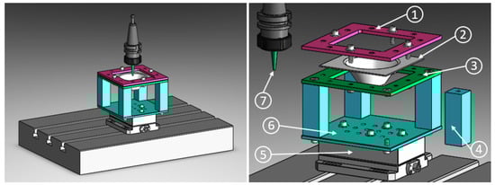 CNC milling machine set up for single point incremental forming process: (1) Top plate; (2) Sheet blank; (3) Clamping plate; (4) Hollow support; (5) Dynamometer; (6) Bottom plate and (7) Forming tool.