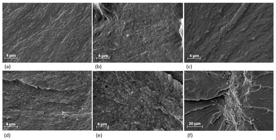 SEM images of the cross-sectional area for UHMWPE samples: (a) Reference, (b) M1, (c) M2; (d) M3; (e,f) M4. Satisfactory homogeneous dispersion of NPs are found at low concentrations (≤0.75 wt %) with considerable clusters after 1 wt %. No phase separations were found.