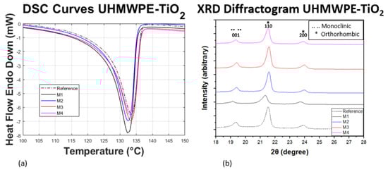 (a) DSC thermograms and (b) XRD diffractogram of the UHMWPE sample (Reference) and sheet composites (M1–M4). The degree of crystallinity behaves partially constant through the addition of TiO but with the formation of a monoclinic crystal phase as a consequence of the stress component induced during the hot-pressing manufacturing process.