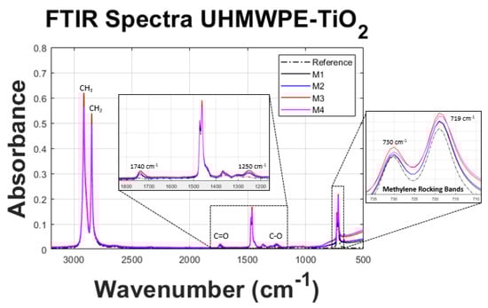 FT-IR spectra of the produced material samples. The well known vibrational bands corresponding to UHMWPE are visible in all the samples, with a positive interaction of TiO NPs with the polymeric chains, observable in bands 1740 cm (C=O) and 1250 cm (C-O).
