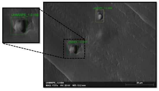 The absorbance spectra for all the samples are shown in Figure 5. The results show that the position of infra-red absorption peaks of UHMWPE-TiO composites has no change with the addition of TiO NPs. The modes detected for UHMWPE Reference sample show peaks at 2924 cm and 2851 cm, which correspond to the asymmetric and symmetric stretching mode of C-H, respectively. The mode at 1469 cm represents the in-plane bending vibration of C-H, and the modes at 730 cm and 719 cm are related to methylene rocking vibrations, which are attributed to the high degree of polymerization and long molecular chains of UHMWPE []. The incorporation of the TiO NPs in the UHMWPE polymeric matrix promotes the carbon–oxygen interaction as it was detected in the modes at 1740 cm (C=O) and 1250 cm (C-O). The detection of such modes indicates that the TiO NPs are interacting with the polymeric chains thus the degradation of UHMWPE is caused by their photo-catalytic activity []. Additionally, as a result of the incorporation of TiO in different concentrations, the methylene rocking modes at 730 cm and 719 cm show an increment of amplitude which is associated with a crystallization process in the composite materials []. In summary, the carbon–oxygen interaction indicates that the TiO NPs are covered by polymeric chains. This is confirmed by the SEM-EDS image, Figure 6, that shows the presence of an amorphous layer of the polymer material that covers the TiO NP surface [,].