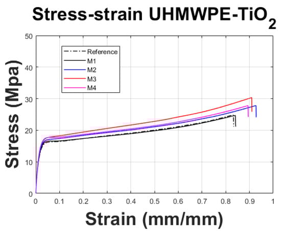 Stress–strain curves of UHMWPE-TiO nanocomposites. Mechanical properties increased with the addition of TiO NPs. For M3 sample, the UTS and strain elongation increased 30% and 10% respectively, before failure.
