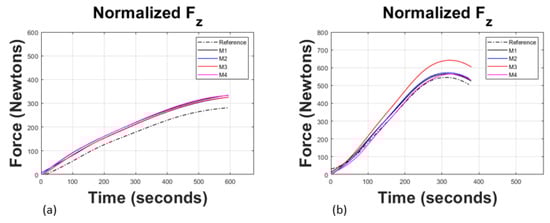 Normalized forces on the z-axis acting over the surface of the nanocomposite plate during SPIF: (a) with a forming tool diameter of 5 mm; (b) with a tool diameter of 10 mm. Notice that the magnitudes of the forming forces during the SPIF of the facial prostheses with a 5 mm tool diameter are lower than those recorded when using the tool with 10 mm.