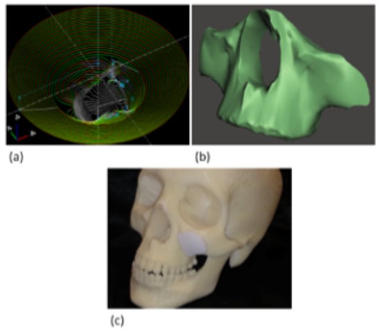 Facial prosthesis prototyping: (a) SPIF tool path followed by the CNC vertical milling machine for the fabrication of the prosthesis; (b) patient tomography; (c) manufactured facial prosthesis mounted on a human skull model.