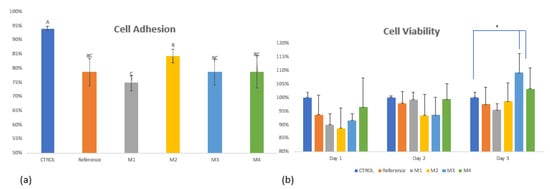 The biological feasibility of the sheet composites was investigated by studying cell adhesion and cell growth, and the results are shown in Figure 10. The percentage of adherent cells on the composite material samples was lower than the control well plate. Notice that the UHMWPE is able to support the cell attachment without any treatment due their biocompatibility properties. It is also observed in Figure 10 that the addition of up to 1 wt % of TiO has no statistical variations against UHMWPE; however, it has been reported that the use of higher TiO concentrations can increase the hydrophobicity and therefore improve cell behavior []. Furthermore, the results of cell viability through time, Figure 10b, indicates that all the produced samples do not have deleterious effects on cell growth. At the beginning of the assay, the cell viability of samples was among 88–95% compared with the control; after 72 h, the sample M3, with 0.75 wt % of TiO, presented the highest viability value (109%). This shows that the addition of TiO to the polymeric matrix influences cells growth.