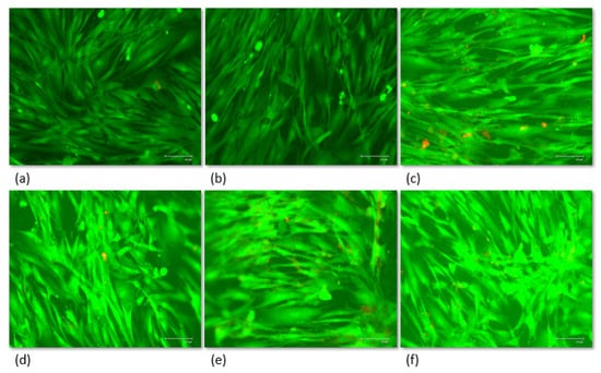 Fluorescence microscope images of human fibroblast cell growth on the surface of UHMWPE composites after 72 h: (a) control sample; (b) reference; (c) M1; (d) M2; (e) M3; (f) M4. Almost null cytotoxicity is reported.