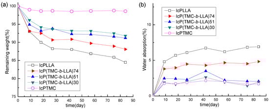 For further biomedical applications, the studies would perform with physiological-like fluids []. Here, the hydrolytic degradation of the polymers was performed in pH 7.4 PBS at 37 °C. Figure 1a shows the evolution of the remaining weight of the linear-comb diblock copolymers as well as their homopolymers during 84 day-degradation. Homopolymer lcPTMC degrades extremely slow, as its remaining weight changes little during the 12 weeks. This is in agreement with the linear PTMC almost not degrade by pure hydrolysis in pH 7.4 phosphate-buffered saline (PBS) []. In contrast, the remaining weight of the block copolymers show some differences. Sample lcP(TMC-b-LLA)30 appears the most resistant to hydrolysis degradation among the block copolymers with 91.8% weight remaining after 12 weeks due to its low lactide content. Weight loss of the copolymers increases with LA content. Even though longer PLLA chain results in higher crystallinity, which would lead to slower degradation. PLLA block degraded much faster than PTMC block in the graft copolymer, no matter the PLLA parts crystallized or not. Homopolymer lcPLLA shows the fastest degradation rate with about 84.5% remaining weight at last. The higher LA content in the lcP(TMC-b-LLA) copolymer, the faster weight decreases, since ester bonds are more susceptible to hydrolysis than carbonate bonds [].