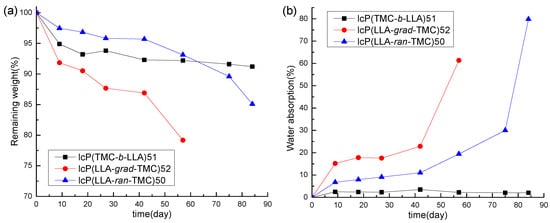 Weight retention (%WR) (a) and water absorption (%WA) (b) of the linear-comb PLLA/PTMC copolymers with block, gradient, and random sequence structures.