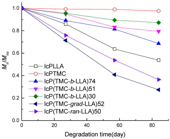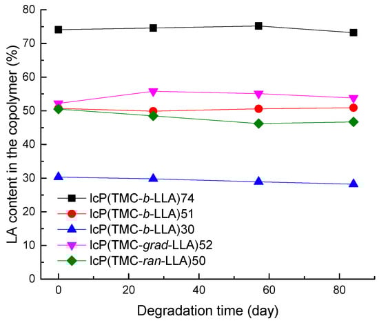 The Detailed analysis of compositional changes in the copolymers during degradation has been monitored by 1H NMR. The LA contents of linear-comb PLLA/PTMC copolymers with different sequence structures remain constant during the degradation period, as shown in Figure 4. This finding could be assigned to the loss of TMC components together with the degradation of LA moieties, even PTMC itself does not degrade in phosphate-buffered saline without enzyme. Similar findings have also been reported in the case of other polylactide copolymers [,]