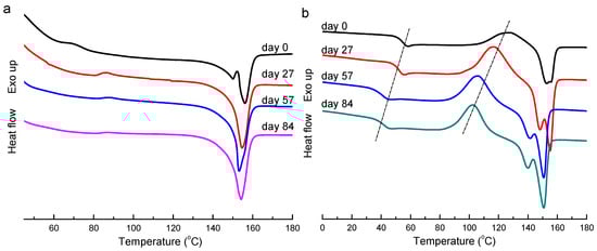 Differential scanning calorimeter (DSC) evolution of lcP(TMC-b-LLA)74 copolymer during degradation: (a) first heating, (b) second heating.