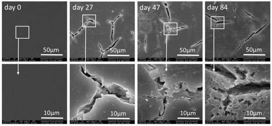 SEM is used to monitor the film surface morphology changes during hydrolytic degradation. Figure 6 shows the SEM photographs of lcP(TMC-b-LLA)30 specimens after 0, 27, 47 and 84 days degradation. The copolymer presents a perfectly smooth surface before degradation. After 27 days of degradation, the surface appears slightly eroded to leave some cracks. At day 47, surface erosion continues, and the surface becomes more rugged. After 84 days, cracks grow deeper and larger, porous structures are also observed around cracks on the surface.