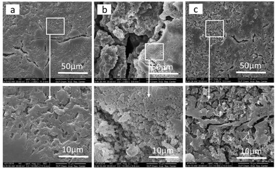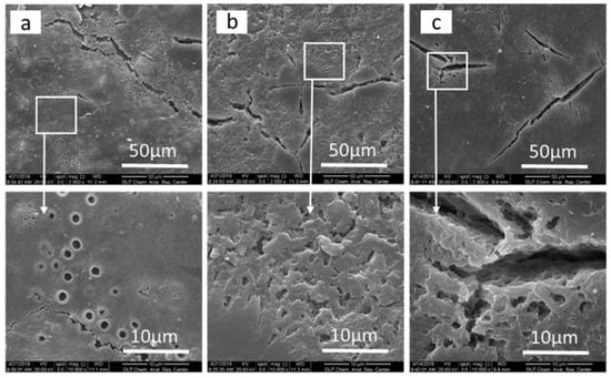 SEM images of samples after 84 days: (a) lcP(TMC-b-LLA)51, (b) lcP(LLA-grad-TMC)52, (c) lcP(LLA-ran-TMC)50.