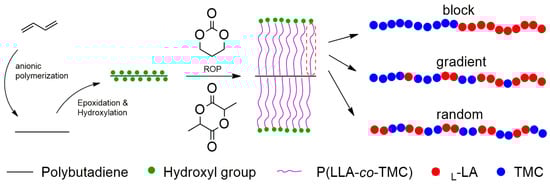The linear-comb copolymers of TMC and LA were designed with block, gradient, and random side chains. These copolymers were all successfully synthesized as described in our previous study [], as shown in Scheme 1.