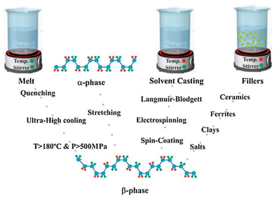 Approaches for obtaining the β phase of PVDF. From the melt, the α phase, or by solvent casting and adding fillers. Reproduced form [18], with permission from Elsevier, 2014.