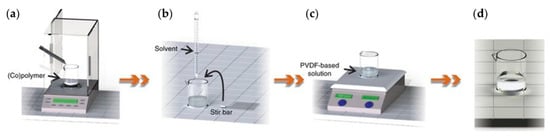 Procedure of preparing PVDF-based solution: (a) weigh the solute; (b) add solvent and magnetic stir bar; (c) magnetic stirring; (d) a transparent and homogeneous solution is obtained. Adapted from [19], with permission from Springer Nature, 2018.