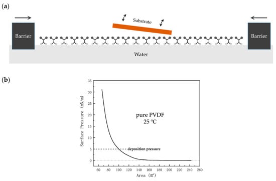 Together with Blodgett and Schaefer, Langmuir developed technology for obtaining single/multiple molecular monolayer(s) by spreading the amphiphilic molecules onto water and then transferring to a substrate vertically or horizontally [11], as shown in Figure 4a. Although PVDF and its copolymers are not amphiphiles, amphiphilic properties are not necessary for LB deposition [57]. The Langmuir films of PVDF and its copolymer can be prepared from solutions of 0.01%–0.10% weight concentration in DMSO or acetone. By spreading a small amount of solution, the molecules floating on the water surface can be compressed by a moving barrier to form a dense monolayer. Important information about the monolayer state on a water surface can be obtained from the pressure–area isotherm—the dependence of the surface pressure on film area, as illustrated in Figure 4b.