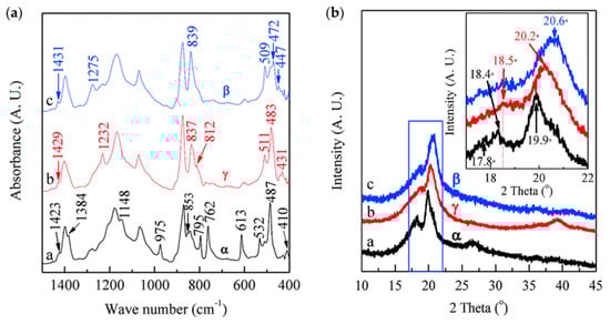 According to the aforementioned FTIR spectrum, it is easy to differentiate α phase from β and γ phases, but the β and γ phases can be easily confused. XRD results can work as a supplement for FTIR to distinguish β and γ phases [4]. Although studies have proposed and validated general procedures for phase identification based only on FTIR results [65], XRD is still worthy of mention here, as shown in Figure 5b.