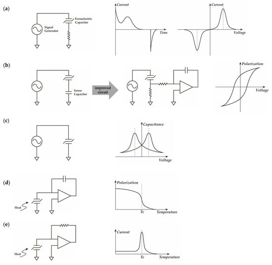 Figure 6 shows each of the typical test circuits and corresponding results. Figure 6a illustrates the I–t curve at impulse voltage and the I–V response of ramp voltage. The switching and non-switching currents can be determined from the I–t curve, while the value of coercive voltage can be acquired from the I–V curve. The basic Sawyer–Tower circuit for hysteresis loop measurement is shown in Figure 6b, and a virtual ground is often added to avoid noise, as presented in the improved circuit. In Figure 6c, with a small signal superposed DC voltage bias, the circuit is used to measure the C–V curve. Temperature-related properties such as the Curie point can be determined by the circuits shown in Figure 6d,e [82].