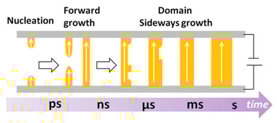 In the study of ferroelectric barium titanate (BaTiO3), Merz [102,103], Little [104], Miller [105,106], and Fatuzzo [107] established the universal mechanism of polarization switching, which is generally expressed in three steps: nucleation, forward domain growth, and succedent sideways growth. Firstly, an electric field with opposite polarity to ferroelectric polarization stimulates the small nuclei of the domain to form at the grain boundaries or interfaces. Then, each nucleus grows forward until it reaches the opposite side and becomes a domain. Finally, domains grow sideways and start to unite. This continuous process does not stop until the polarization is completely reversed in the whole sample, as shown in Figure 7 [93].