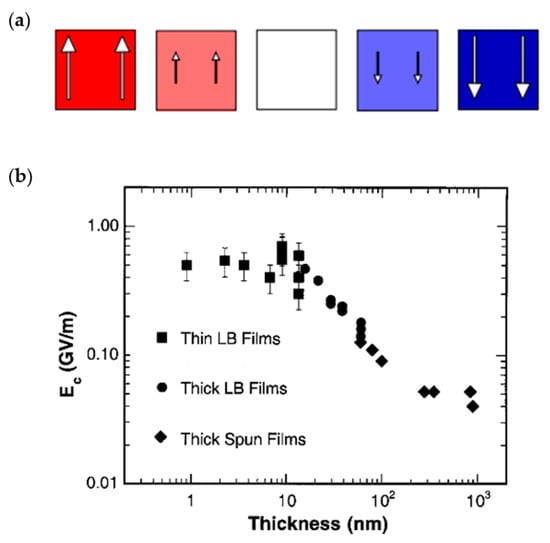 (a) Polarization switches uniformly without domain formation. (b) The thickness-dependent coercive field of P(VDF-TrFE). Reproduced from [84,118], with permission from American Physical Society, 2010 and 2000, respectively.