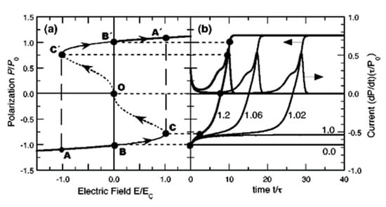 By solving Equation (9), the switching time τ, defined as the time needed by the polarization to change from a stable state to zero, is depicted in Figure 9b. It is obvious that if E is not more than Ec, the switching time τ tends to infinity, which mean that the polarization could not be reversed [110].