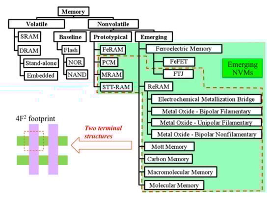 Memory taxonomy. Many emerging nonvolatile memories (NVMs) are in simple two-terminal devices and suitable for high-density crossbar arrays. Reproduced from [128], with permission from Elsevier, 2016. SRAM: static random access memory; DRAM: dynamic random access memory; PCM: phase change memory; MRAM: magnetic random access memory; STT-RAM: spin torque transfer random access memory; FeFET: ferroelectric field effect transistor; ReRAM: resistive random access memory; FTJ: ferroelectric tunneling junction.