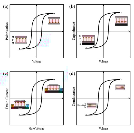 Schematic of different ferroelectric memories: (a) polarization–voltage hysteresis of a metal–ferroelectric–metal (MFM) capacitor; (b) capacitance–voltage hysteresis of a metal–ferroelectric–insulator–semiconductor (MFIS) diode; (c) drain current–gate voltage hysteresis of FeFET; (d) conductance–voltage hysteresis of FTJ.
