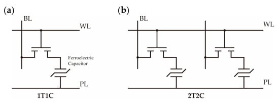 For the first category, the memory cell can be formed by connecting an MFM capacitor and a transistor in a 2T2C (two-transistor–two-capacitor) or 1T1C (one-transistor–one-capacitor) structure [130], as shown in Figure 12. In the early stages of development, a self-referencing 2T2C cell was adopted to ensured stable access operation; later, a 1T1C cell was introduced and shrank the required area by nearly half [1]. However, 1T1C cells operate in a destructive read-out manner, and thus the data have to be restored by a rewriting cycle after readout.