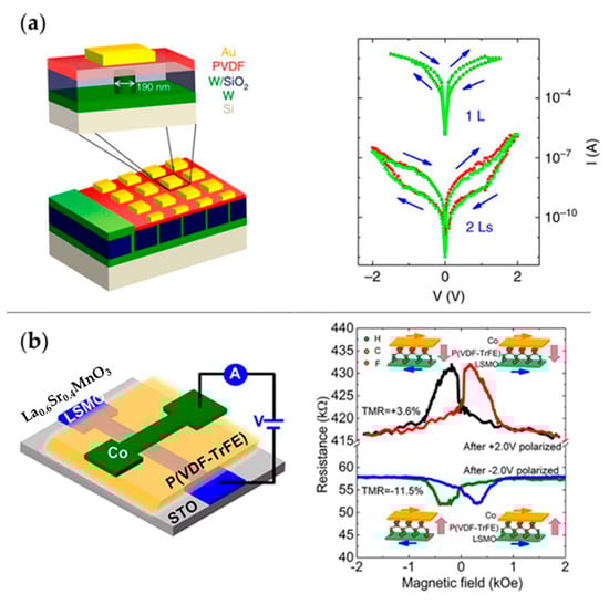 - Lopez-Encarnacion, J.M.; Burton, J.D.; Tsymbal, E.Y.; Velev, J.P. Organic multiferroic tunnel junctions with ferroelectric poly(vinylidene fluoride) barriers. Nano Lett. 2011, 11, 599–603. [Google Scholar] [CrossRef]