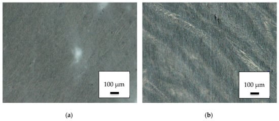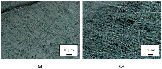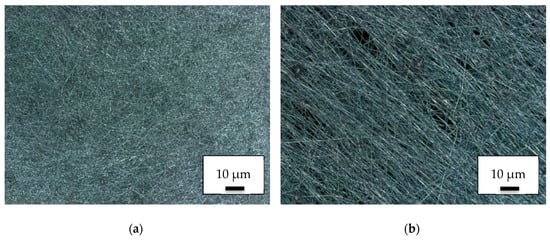 Since wettability is a defining property for filter applications, contact angle measurements were performed. Figure 7 shows contact angle measurements on a pure TPU layer (Figure 7a) and on the PAN/TPU composite surface (Figure 7b), respectively. Although the original PAN nanofiber mat exhibited a contact angle of (31 ± 3)° [], a hydrophobic contact angle of (99 ± 2)° was measured on the pure TPU layer. With (36 ± 4)°, the composite showed a slightly increased contact angle as compared to the pure nanofiber mat. Opposite to the previously investigated PAN/PLA composite surfaces, here no directional dependence of the water spreading in the composite surface could be recognized, making the softer PAN/TPU composite possibly better suited for water filtration, since the orientation with respect to the direction of water flow likely causes less variance.