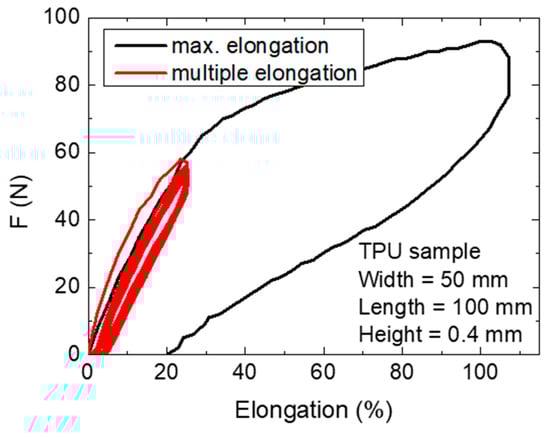 As expected, the highly elastic TPU samples could be stretched by more than 100% without breaking. The values for repeated measurements of only 25% elongation also showed a hysteresis; the curves became nearly identical after few repetitions. After 1 h at rest, the material had relaxed and again started with the first curve offset from those following.