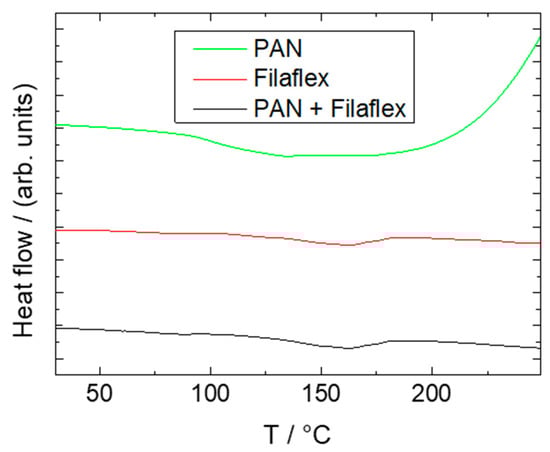 DSC measurements of a pure PAN nanofiber mat, pure Filaflex TPU, and a PAN/Filaflex composite. The lines are vertically offset for clarity.