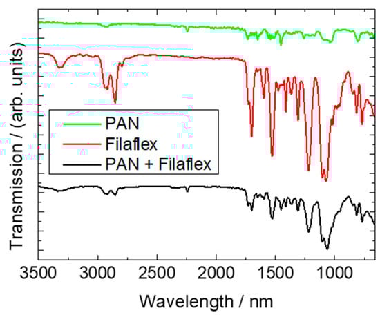 FTIR measurements of a pure PAN nanofiber mat, pure Filaflex, and a PAN/Filaflex composite. The lines are vertically offset for clarity.