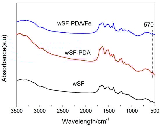 In order to further investigate the changes in the structure of the waste silk surface after various surface modifications, the infrared spectrum analysis was carried out as shown in Figure 2. The untreated and treated waste silk demonstrated rough bands in the region 1660–1630 cm−1, which were attributed to the stretching vibration of amide I. Other characteristics peaks found at 1545–1525 cm-1 are the amide II and 1265–1235 cm−1 is the amide III [33,34]. The FT-IR spectra of sample wSF-PDA and wSF-PDA/Fe showed a characteristic bending at 570 cm−1 [35,36], indicating the formation of Fe–O due to the presence of PDA [30] and subsequent loading of iron particles.