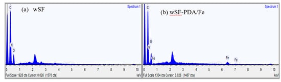 Energy dispersive spectra of (a) wSF and (b) wSF-PDA/Fe.