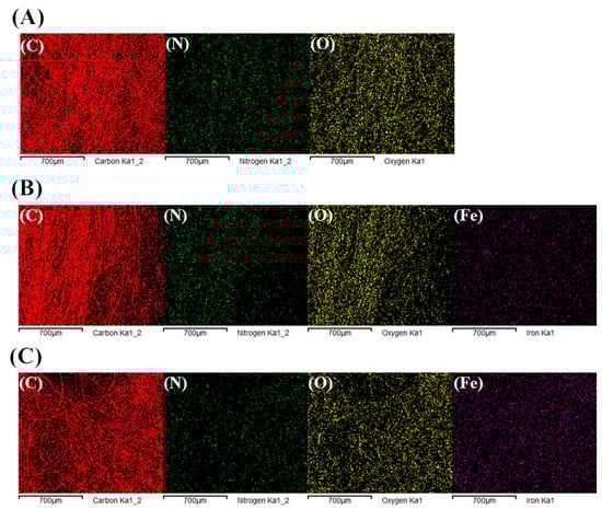 Energy Dispersive X-ray Spectroscopy (A) wS, (B)wSF-PDA, and (C) wSF-PDA/Fe.