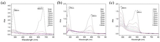 UV-visible absorption spectrum of (a) methylene blue, (b) cationic violet X-5BLN, and (c) reactive orange GRN removal as a function of time. (wSF-PDA/Fe 0.1 g, dye concentration 20 mg/L, H2O2 concentration 1.0 mmol/L, T = 50 °C, pH = 7).