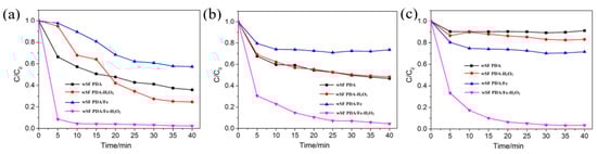 The C/C0 of different samples in the three dye solutions (a) methylene blue, (b) cationic violet X-5BLN, and (c) active orange GRN. (wSF-PDA/Fe 0.1 g, dye concentration 20 mg/L, H2O2 concentration 1.0 mmol/L, T = 50 °C, pH = 7).