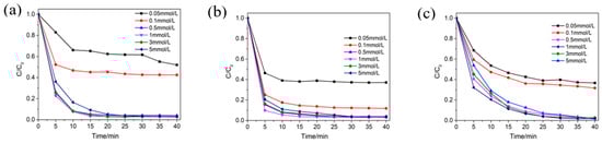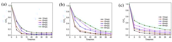 Evolution in time of C/C0 of (a) methylene blue, (b) cationic violet X-5BLN, and (c) reactive orange GRN removal as a function of dye concentration. (wSF-PDA/Fe 0.1 g, H2O2 concentration 1.0 mmol/L, T = 50 °C, pH = 7).