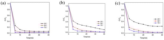 Evolution in time of C/C0 of (a) methylene blue, (b) cationic violet X-5BLN, and (c) reactive orange GRN removal as a function of reaction temperature. (wSF-PDA/Fe was 0.1 g, dye concentration 20 mg/L, H2O2 concentrations 1.0 mmol/L, pH = 7).