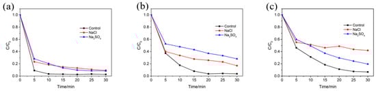 Evolution in time of C/C0 of (a) methylene blue, (b) cationic violet X-5BLN, and (c) reactive orange GRN removal as a function of electrolyte. (wSF-PDA/Fe 0.1 g, dye concentration 20 mg/L, H2O2 concentration 1.0 mmol/L, T = 50 °C, NaCl, Na2SO4 concentration 40 g/L, pH = 7).