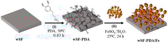 Schematic illustration of the preparation process of (i) grafting of polydopamine (PDA) on waste silk fibers (wSF) and (ii) loading of iron on dopamine grafted waste silk fibers (wSF-PDA).