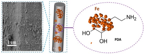 Fenton and Fenton-like treatments showed superior pollutant degradation/reduction efficiency compared with microbial oxidative metabolism, and physical adsorption also has some drawbacks [15,16,17,18]. Several new treatment configurations were introduced to optimize the Fenton process including a photo-assisting process to reduce iron supply [19,20], use of solid iron, or avoid modifying the natural pH value of wastewater [21], and so on. However, one of the drawbacks of this system still remained the separation of iron sludge in the solution after the treatment and recycling before discharging the treated wastewater. This is a time consuming and costly procedure [22]. Immobilization of iron particles (Fe) may become an appropriate and permanent remediation technique to solve this problem. However, it is important to immobilize Fe onto a carrier that can be easily separated from the contaminated water solution as well as provide no/less harm on subsequent management. The Fe immobilized inpolyacrylic acid(PAA) [23,24], starch [25], and polyglycol [26] reported in different literature are difficult to recycle once they are used to treat contaminants. To avoid secondary water contamination, immobilization of zero-valent iron (ZVI) onto solid supports, for example, polymeric membranes [27] and activated carbon [28], could be an ideal option. Morshed et al. [29] immobilized and stabilized ZVI nanoparticles on fibrous polyester. Very few literatures have been found on the use of textile fibers or fabrics to immobilize iron particles aiming heterogeneous catalytic application.