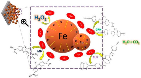 - Morshed, M.N.; Bouazizi, N.; Behary, N.; Guan, J.; Nierstrasz, V. Stabilization of zero valent iron (Fe0) on plasma/dendrimer functionalized polyester fabrics for Fenton-like removal of hazardous water pollutant. Chem. Eng. J. 2019, 374, 658–673. [Google Scholar] [CrossRef]