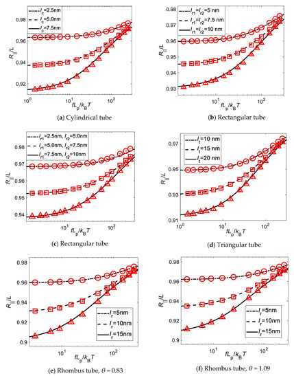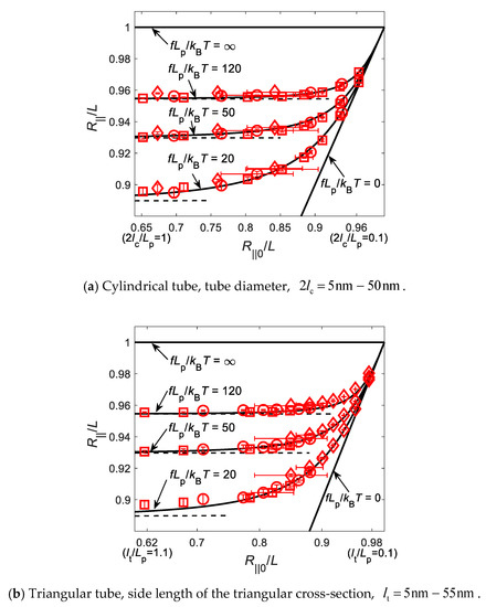 In order to investigate how the tube size or the unstretched extension, , may influence the force-confinement-extension relation, we considered the confinements of tubes with circular and triangular cross-sections. We performed extensive Brownian dynamics simulations based on the GBR model to investigate the extension of the chains confined in tubes of various sizes and stretched by different tensile forces. Figure 3 shows the relation between the normalized extension, , under tensile force, , and the unstretched extension, , that decreases monotonically with the increase of tube size. Solid and dashed lines in Figure 3 are theoretical predictions based on Equations (23) and (25) under different tensile forces. In Figure 3a, hollow squares, circles and rhombuses represent the simulation results with simulation parameters of contour lengths, L = 100 nm, 150 nm, and 200 nm, total simulation times, 90 µs, 90 µs, and 150 µs, and total simulation trajectories, 69, 112, 69, respectively. In Figure 3b, the simulation results are still represented by the hollow squares, circles and rhombuses, for the contour lengths, L = 100 nm, 150 nm, and 200 nm, total simulation times, 90 µs, 90 µs, and 300 µs, and total simulation trajectories, 84, 50, and 140, respectively. We can observe from Figure 3 that numerical simulations agree very well with the theoretical predictions for wide ranges of tensile forces and tube sizes, though the derivation of Equation (23) assumes strong confinement.